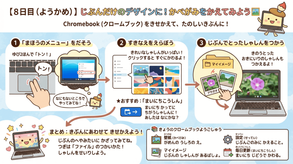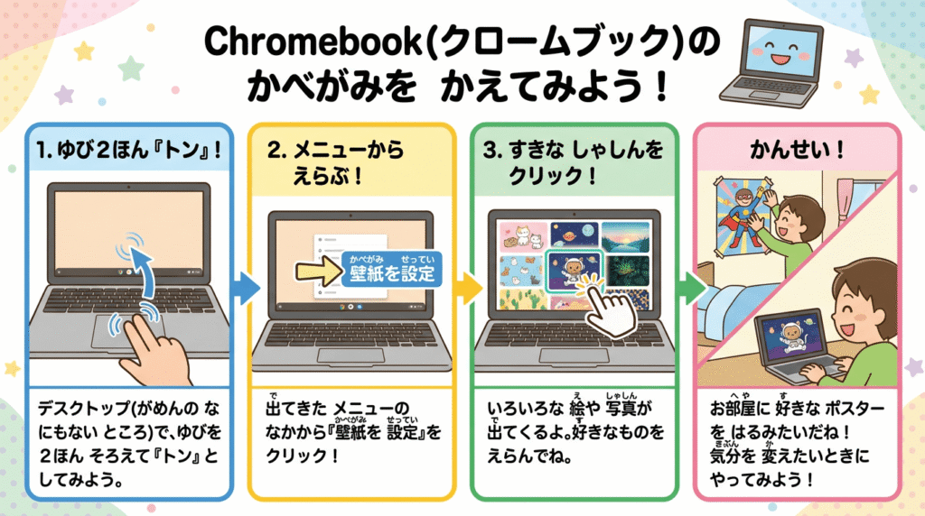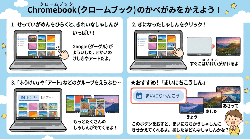 壁紙(かべがみ)を変(か)えると、Chromebookを開(ひら)くたびに楽(たの)しい気分(きぶん)になれますよ。さあ、自分(じぶん)だけのデザインに着(き)せ替(か)えです!