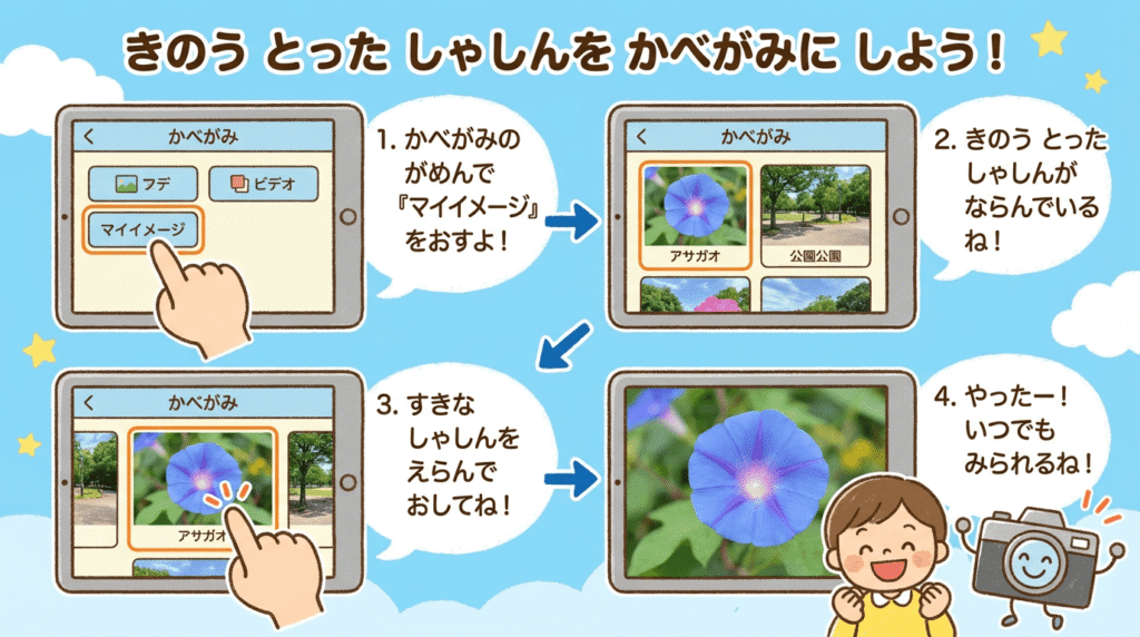 これで、あなたの撮(と)ったアサガオや、お気(き)に入りの場所(ばしょ)が、いつでも画面(がぞう)で見(み)られるようになりました!