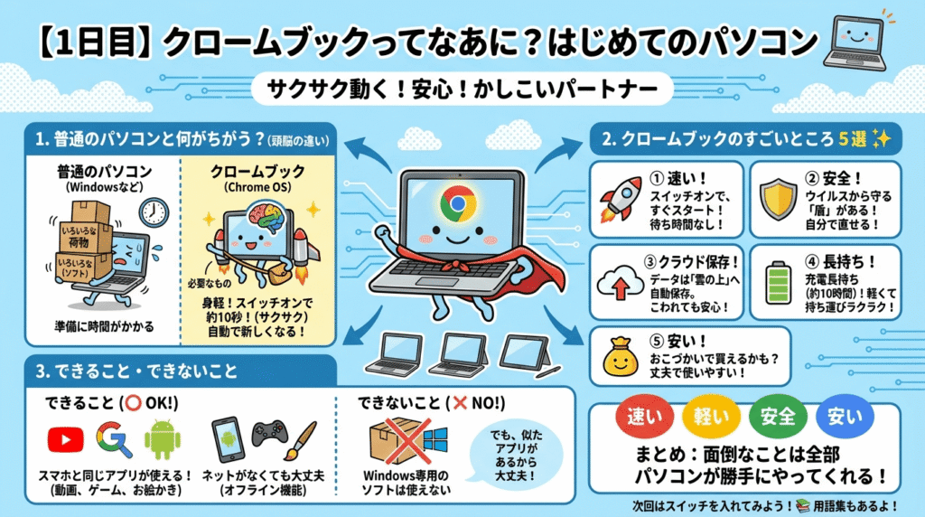 今回はお子様向けに内容をかみ砕き、Chromebookの特徴である「クラウドネイティブ」「セキュリティの堅牢性」を「自動保存」「ガードが固い」といった言葉で表現しました。次回から実際の操作に入ります。