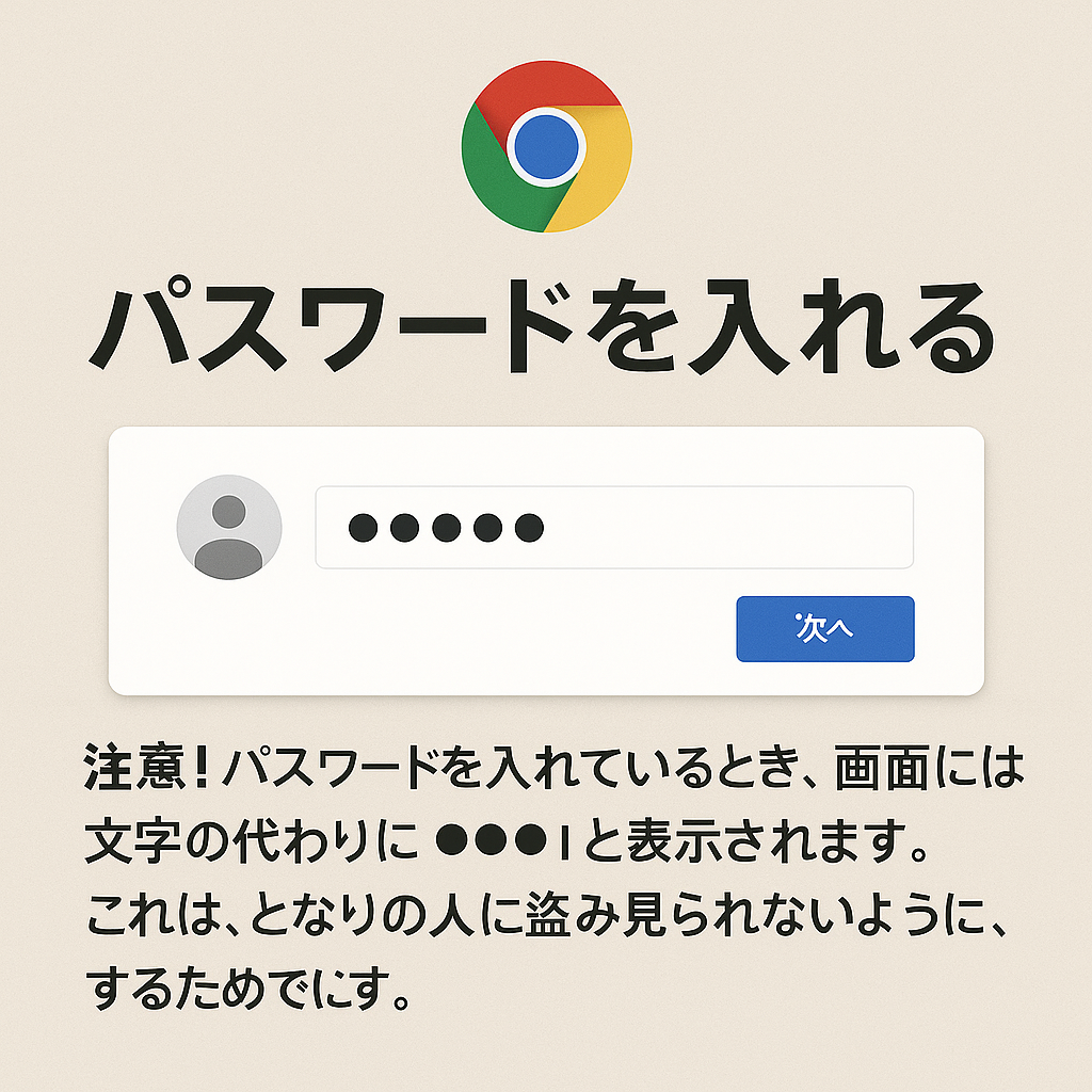 - 注意! パスワードを入れているとき、画面には文字の代わりに ●●●●● と表示されます。これは、となりの人に盗み見られないようにするためです。