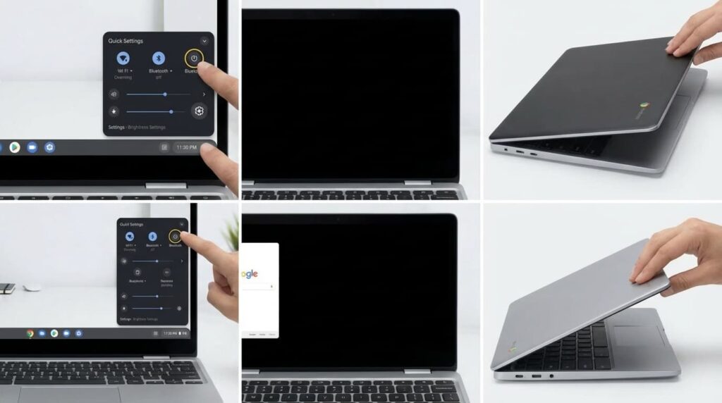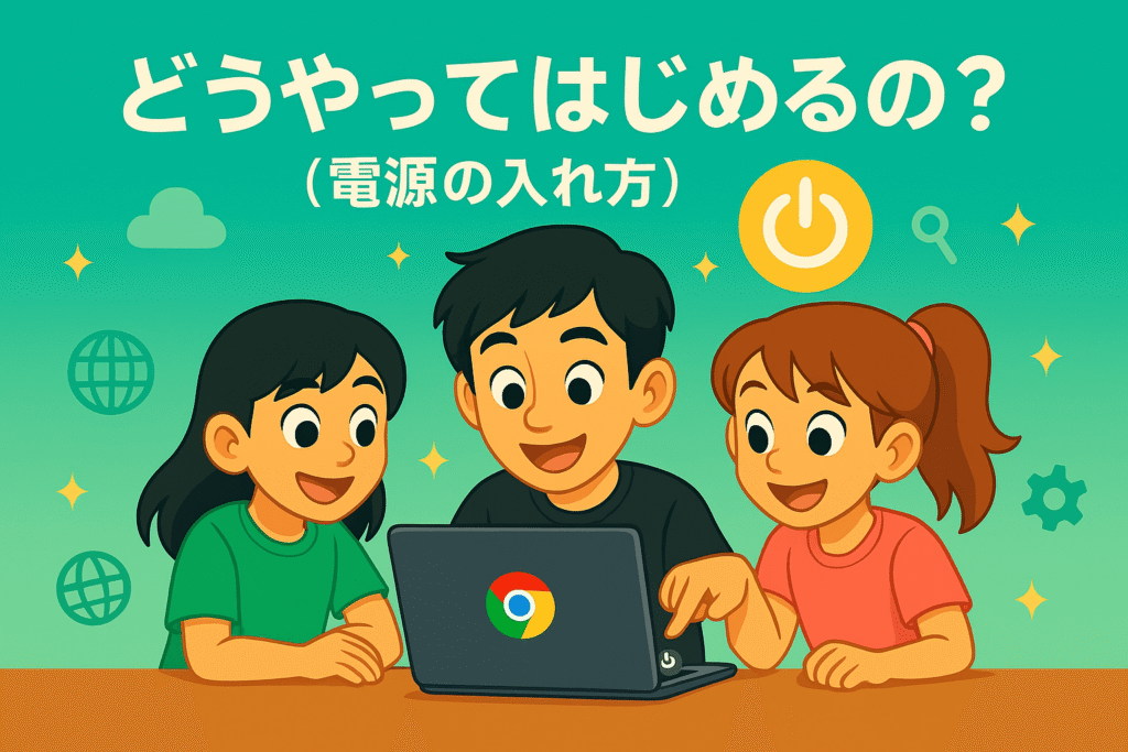 ほとんどのクロームブックは、フタ(画面(がめん))を開(あ)けるだけで、自動的(じどうてき)にスイッチが入ります。