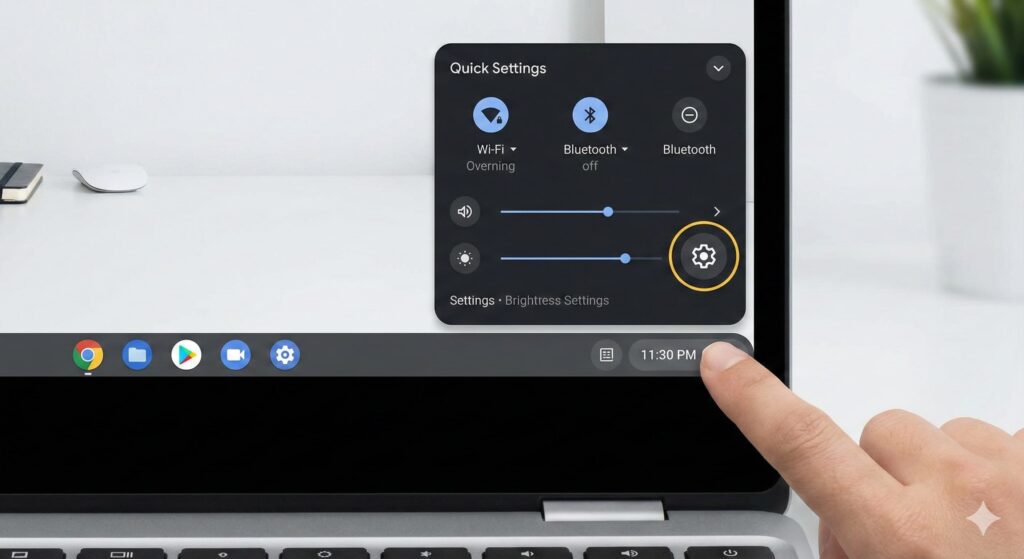 ◎ 🌎 📧 ▶️ 📁 📅 11:30 📶 🔋 - 右下の時計: 時間を見るだけじゃなく、ここを押すと設定(せってい)画面が開きます。