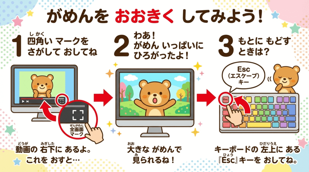 | 全画面(ぜんがめん) | 動画(どうが)を画面(がめん)いっぱいに広(ひろ)げること。「フルスクリーン」とも言(い)います。 |