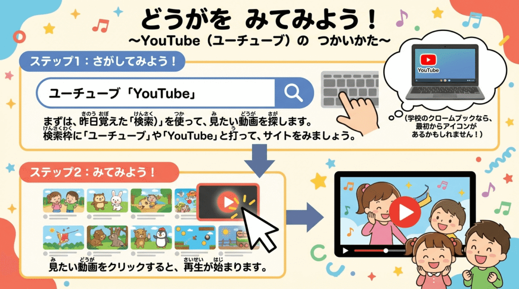 まずは、昨日(きのう)覚(おぼ)えた「検索(けんさく)」を使(つか)って、見(み)たい動画(どうが)を探(さが)します。 検索枠(けんさくわく)に「ユーチューブ」や「YouTube」と打(う)って、サイトをてみましょう。 (学校(がっこう)のクロームブックなら、最初(さいしょ)からアイコンがあるかもしれません!)