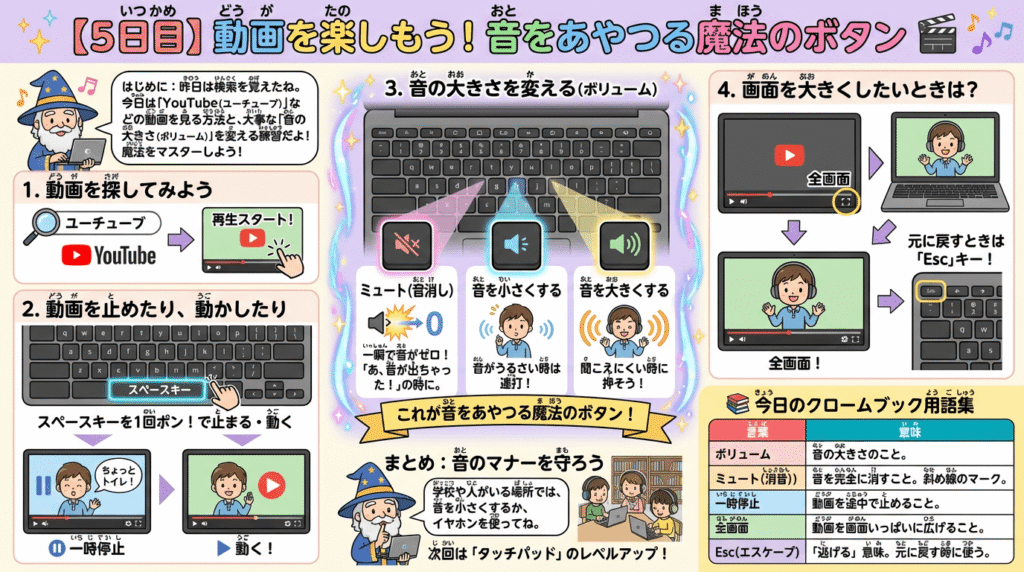 前回(ぜんかい)は、インターネットで検索(けんさく)する方法(ほうほう)を覚(おぼ)えましたね。 今回(こんかい)は、みんなが大好(だいす)きな「YouTube(ユーチューブ)」などの動画(どうが)を見(み)る方法(ほうほう)と、とっても大事(だいじ)な「音(おと)の大(おお)きさ(ボリューム)」の変(か)え方(かた)を練習(れんしゅう)します。