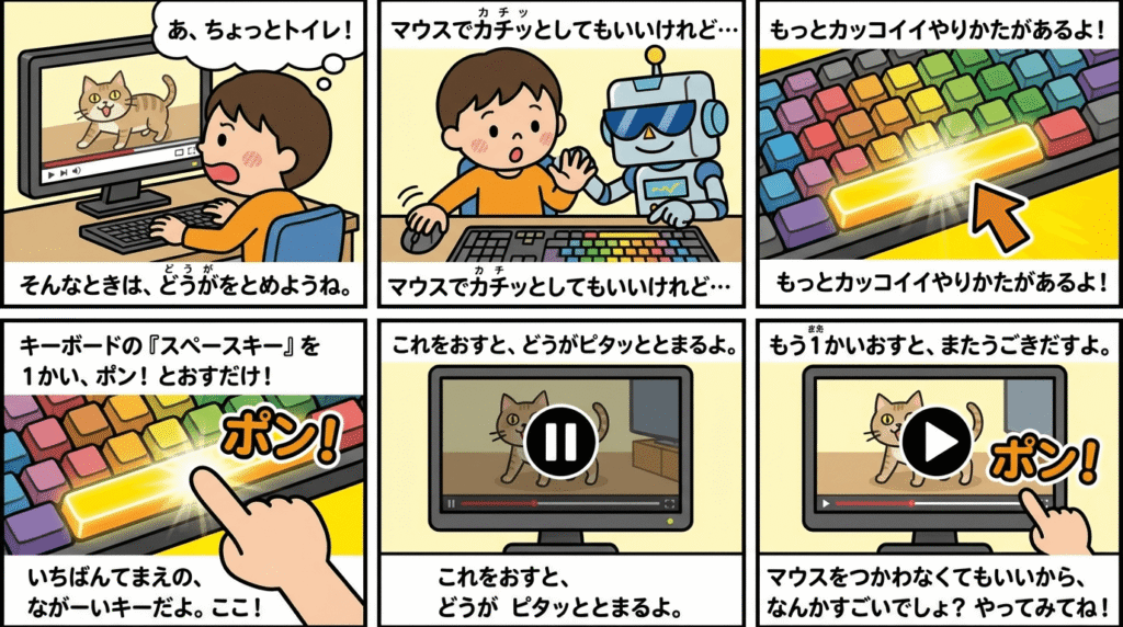 「あ、ちょっとトイレに行きたい!」というときは、動画(どうが)を一時停止(いちじていし)しましょう。 マウスで画面(がめん)をクリックしてもいいけれど、もっとカッコイイ方法(ほうほう)があります。