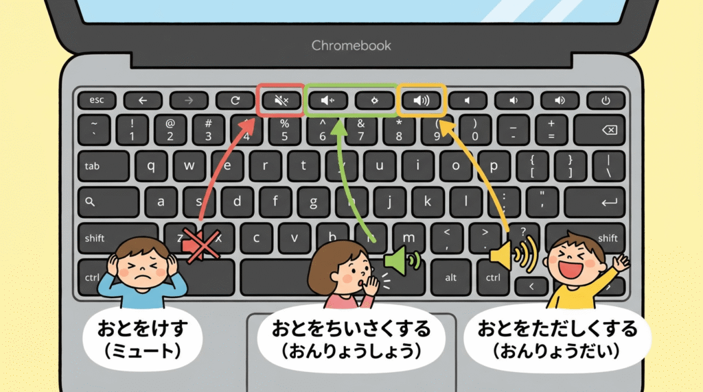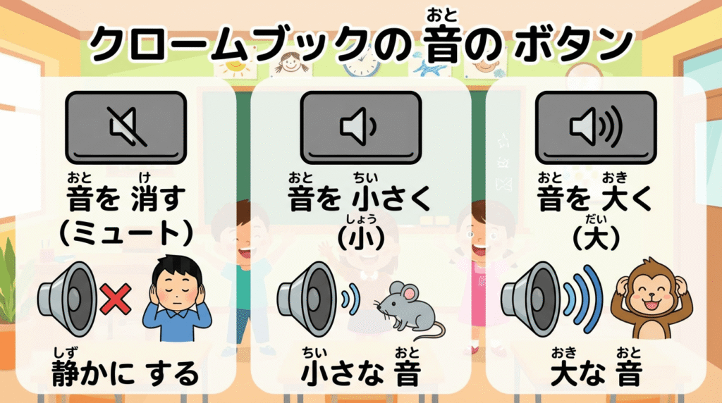 イヤホンの音量: お子様はイヤホンの音量を上げすぎることがあります(難聴リスク)。Chromebookのボリューム設定を確認し、適切な音量を指導してあげてください。